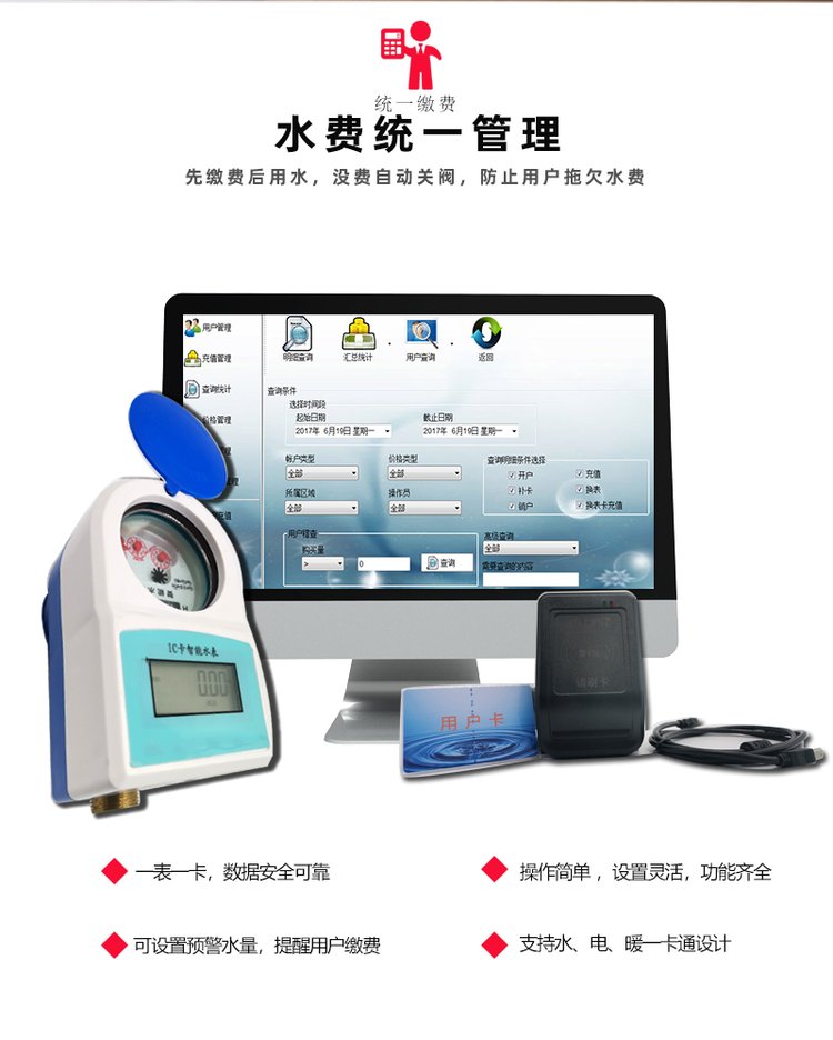 ⊙ 支持水、電、暖一卡通設計,一張用戶卡可以管理多只水表,對于一戶多表的用戶可謂十分方便。