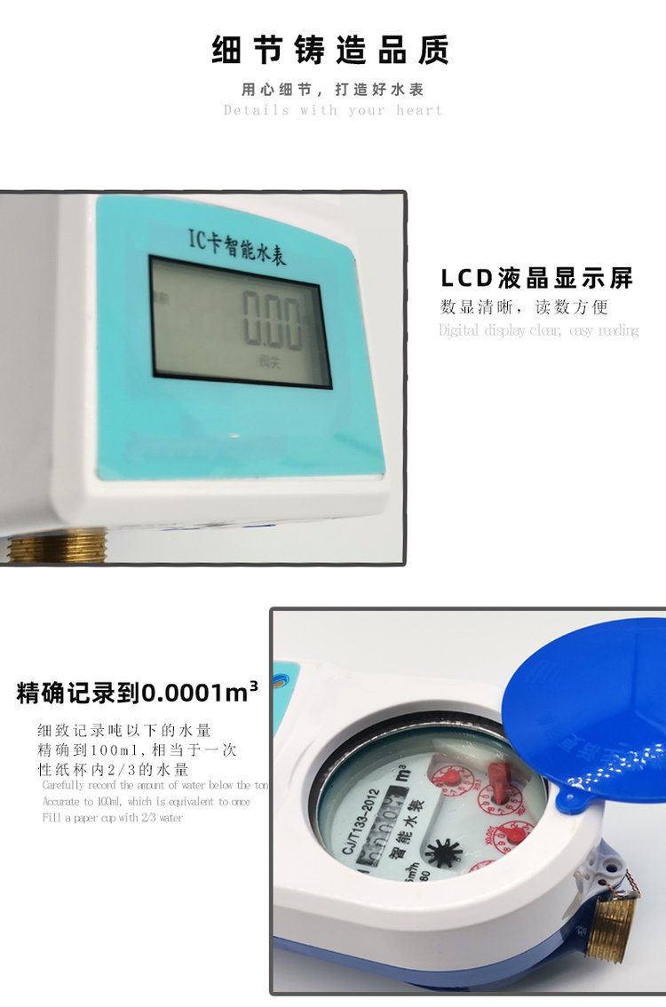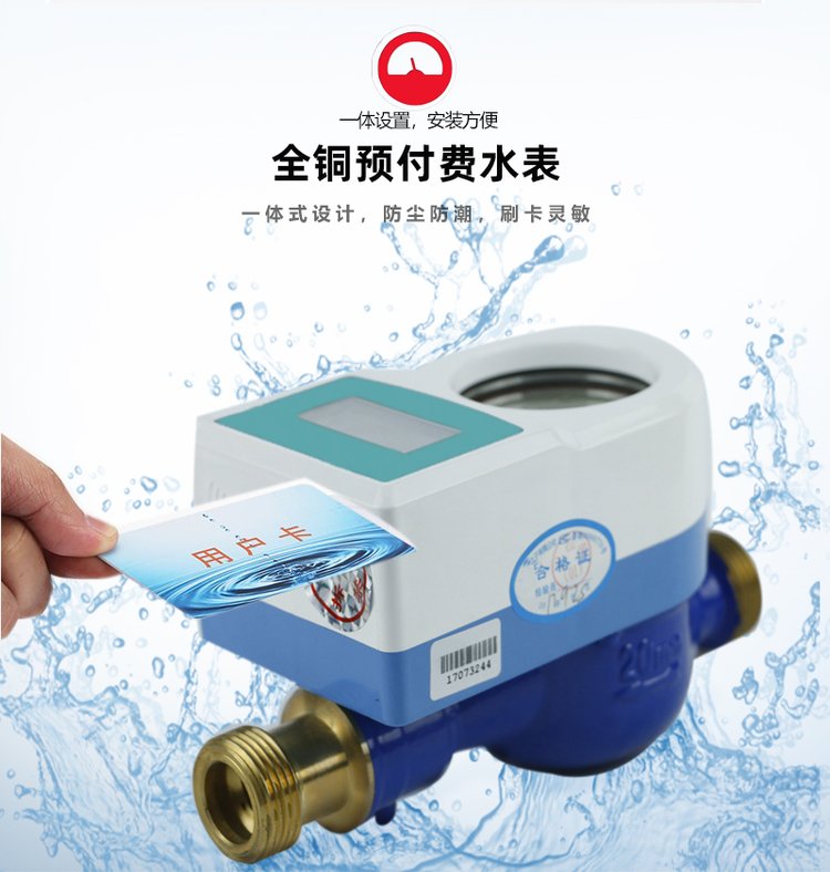 該表采用先進的微電腦控制技術、以射頻卡為信息載體,采用濕式機芯及電池可更換技術,可靠地實現了數據采集、處理、顯示、保存及預付費控制等功能。具有功耗低、抗干擾性強、可靠性高、安裝使用方便等優點,變原有的“先用水,后交費”為“先交費,后用水”,避免了抄表收費給用戶帶來的諸多不便,提高了供水行業及物業服務現代化管理水平,具有良好的經濟效益和社會效益。產品符合GB/T778-2007和CJ/133-2007標準。