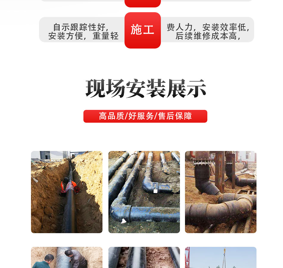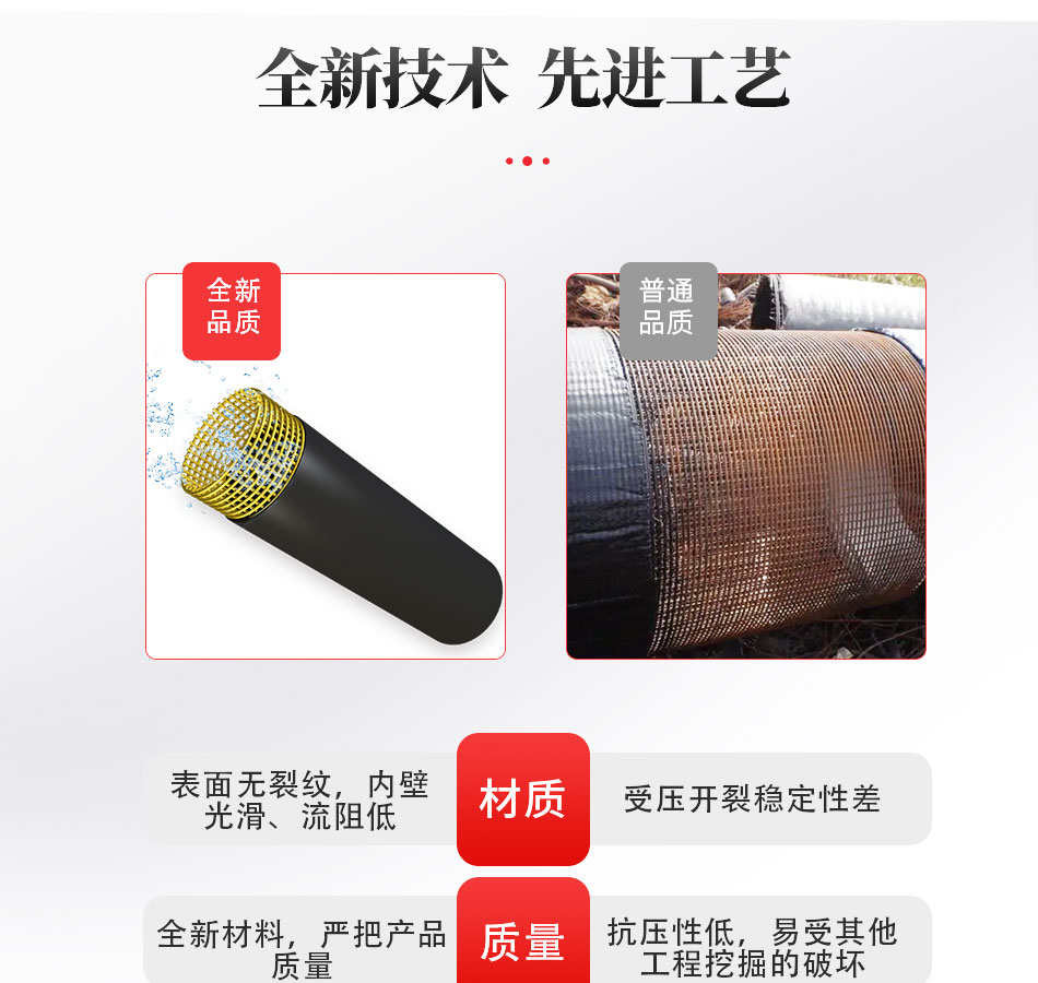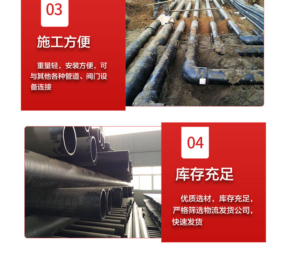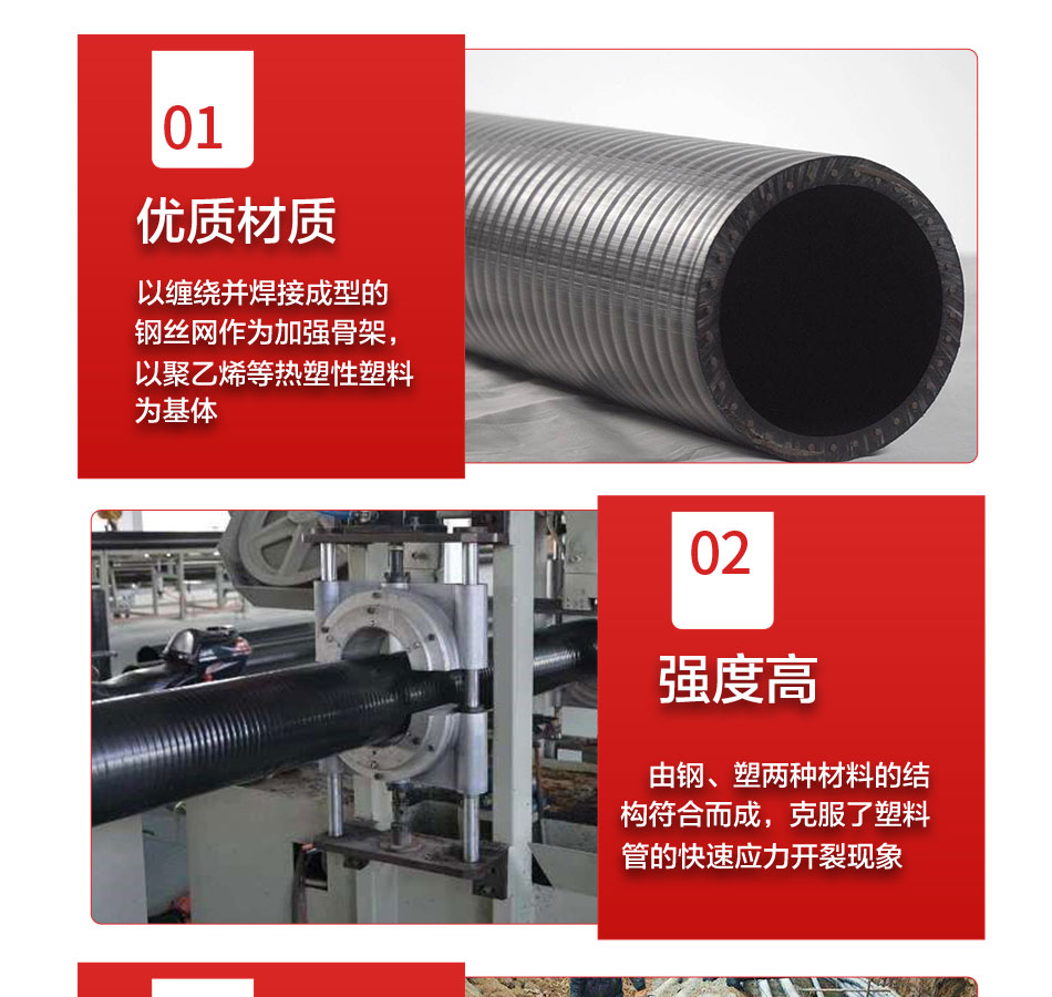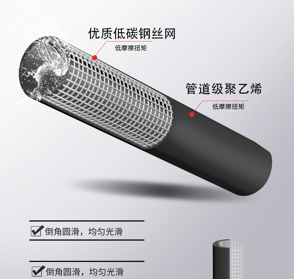 產(chǎn)品介紹:這種新型管道是用高強(qiáng)度過(guò)塑鋼絲網(wǎng)骨架和熱塑性塑料聚乙烯為原材料,鋼絲纏繞網(wǎng)作為聚乙烯塑料管的骨架增強(qiáng)體,以高密度聚乙烯(HDPE)為基體,采用高性能的HDPE改性粘結(jié)樹脂將鋼絲骨架與內(nèi)、外層高密度聚乙烯緊密地連接在一起,使之具有優(yōu)良的復(fù)合效果。因?yàn)橛辛烁邚?qiáng)度鋼絲增強(qiáng)體被包覆在連續(xù)熱塑性塑料之中,因此這種復(fù)合管克服了鋼管和塑料管各自的缺點(diǎn),而又保持了鋼管和塑料管各自的優(yōu)點(diǎn)。鋼絲網(wǎng)骨架塑料復(fù)合管,采用了優(yōu)質(zhì)的材質(zhì)和先進(jìn)的生產(chǎn)工藝,使之具有更高的耐壓性能。同時(shí),該復(fù)合管具有優(yōu)良的柔性,適用于長(zhǎng)距離埋地用供水、輸