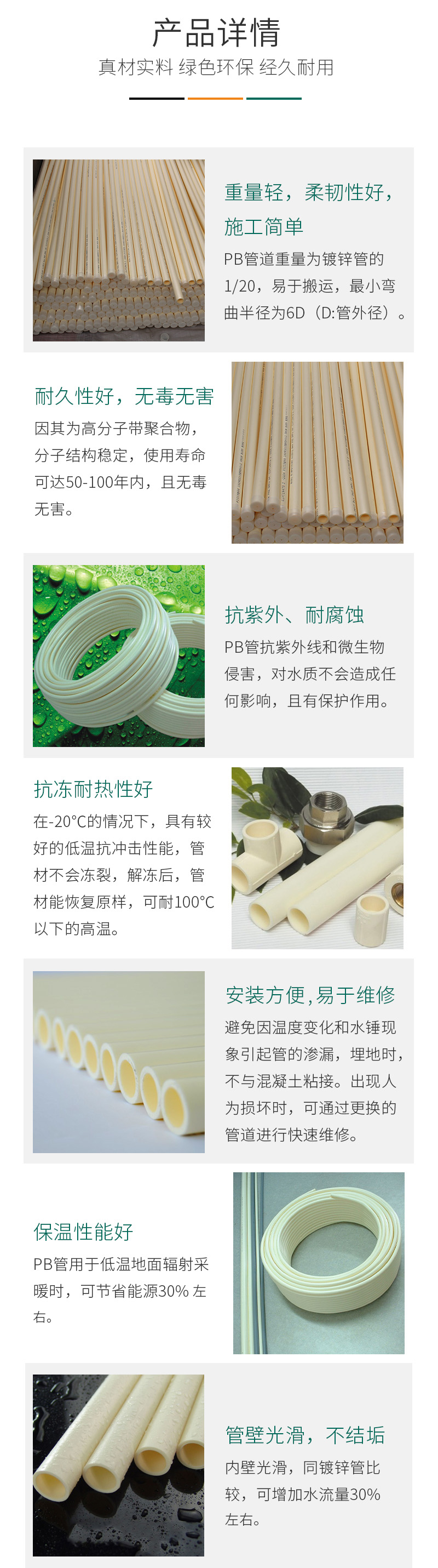 1.重量輕,柔軟性好,PB管重量為鍍鋅鋼管的1/20,易于搬運,材質柔軟,最小彎曲半徑為6D(D:管外徑)